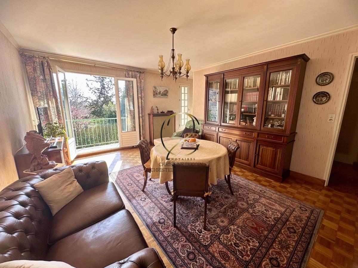 A l'étage, un palier desservant un séjour avec balcon et une salle à manger, une cuisine aménagée, deux chambres confortables ainsi qu'une salle d'eau et un WC indépendant.